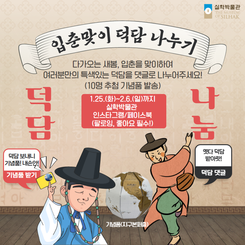 ‘덕담 나누기’ 행사는 실학박물관 SNS를 팔로우한 후 이벤트 게시물에 댓글을 달면 10명을 추첨해서 박물관에서 준비한 기념품을 나눠주는 행사이다. 덕담 나누기 행사는 2월 6일(일)까지 참여할 수 있다.