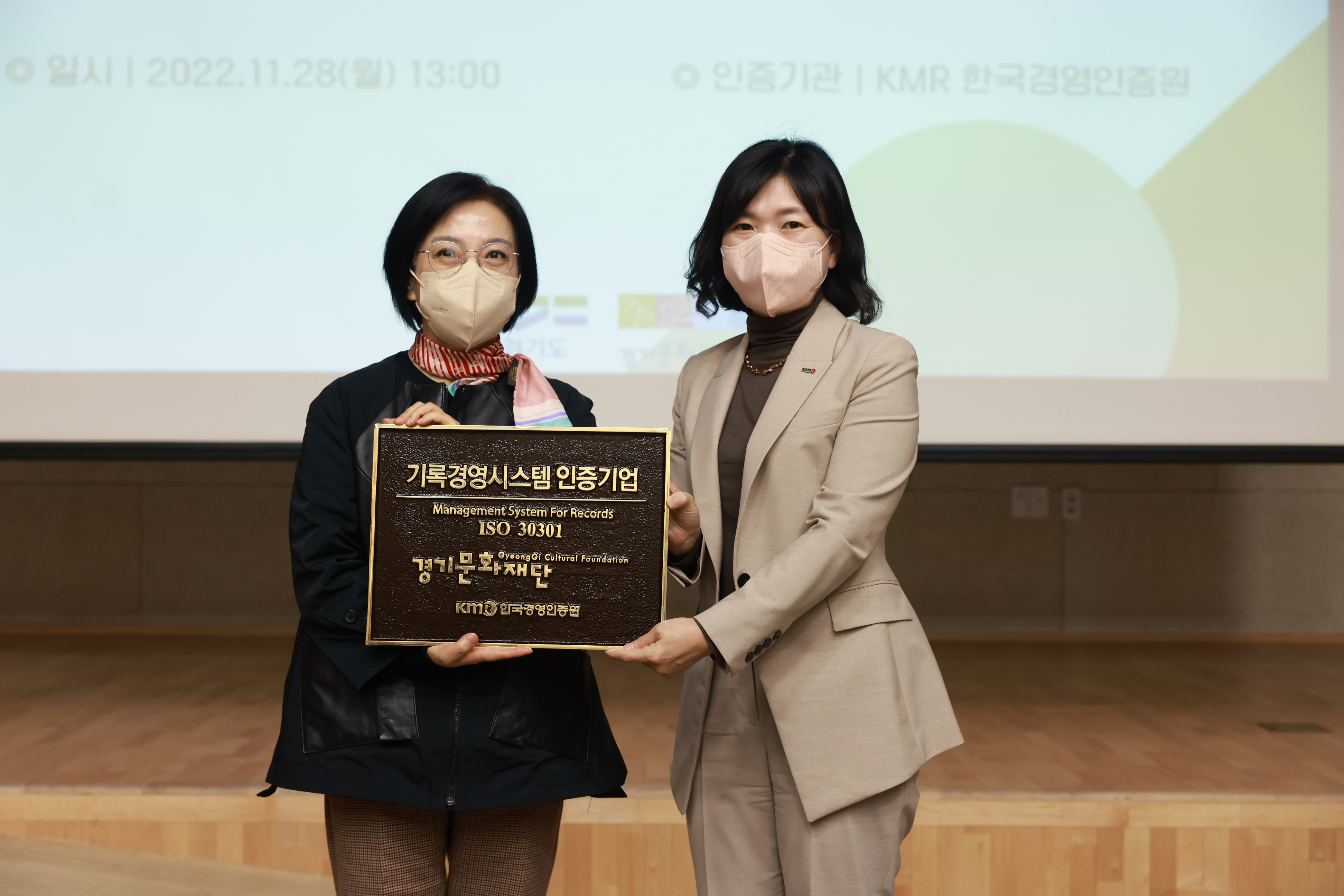 기록경영시스템(IS30301)은 기록경영에 관련된 국제표준으로, 기록관리를 통해 조직의 성과를 높이고 조직이 수행하는 업무의 투명성과 신뢰성 제고를 위한 객관적 인증 체계이다. 경기문화재단은 기록경영시스템 구축을 위하여 조직 내 전사 TFT를 구성하고 내부 심사원 양성 교육과 내·외부 심사를 거쳐 3개 본부를 포함 박물관·미술관 등 27개 모든 부서에서 한국경영인증원 기록경영시스템(ISO30301) 인증을 받게 되었다. 특히, 기록물 관리를 위한 디지털시스템 구축 및 전자결재 시스템 활용 부분이 우수하게 평가되었으며, 리스크관리 시스템과 기록관리기준표 운영도 긍정적 평가에 반영되었다.