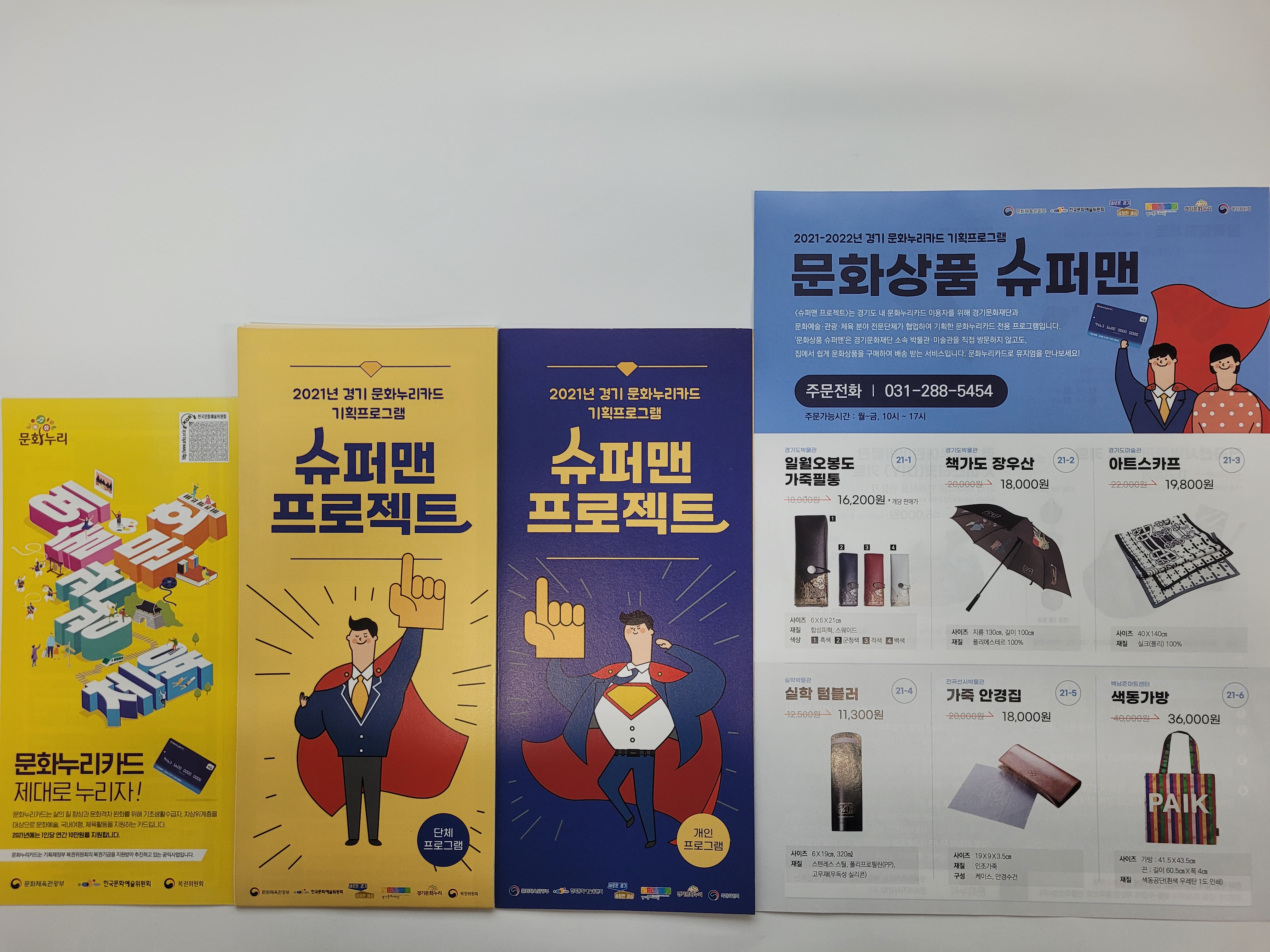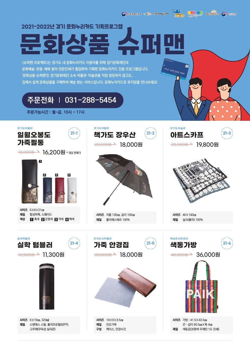 올해 경기문화나눔센터는 코로나19 상황에서도 기초생활수급자 및 차상위계층의 문화격차 완화를 위한 카드이용촉진 프로그램인 ‘슈퍼맨 프로젝트’를 운영하며 이용 활성화에 앞장섰다. 특히 ‘문화상품 슈퍼맨’은 경기문화재단 소속 박물관/미술관 문화상품으로 구성하여, 경기도의 정체성을 담은 문화상품을 문화누리카드 수혜자에게 알리는 동시에, 합리적인 가격으로 구매할 수 있는 서비스를 구축하였다. 직접 방문하지 않고도 집에서 쉽게 문화상품을 구매하여 배송받는 서비스로 노인층 및 거동이 불편한 이동약자 이용자의 만족도를 높였다.