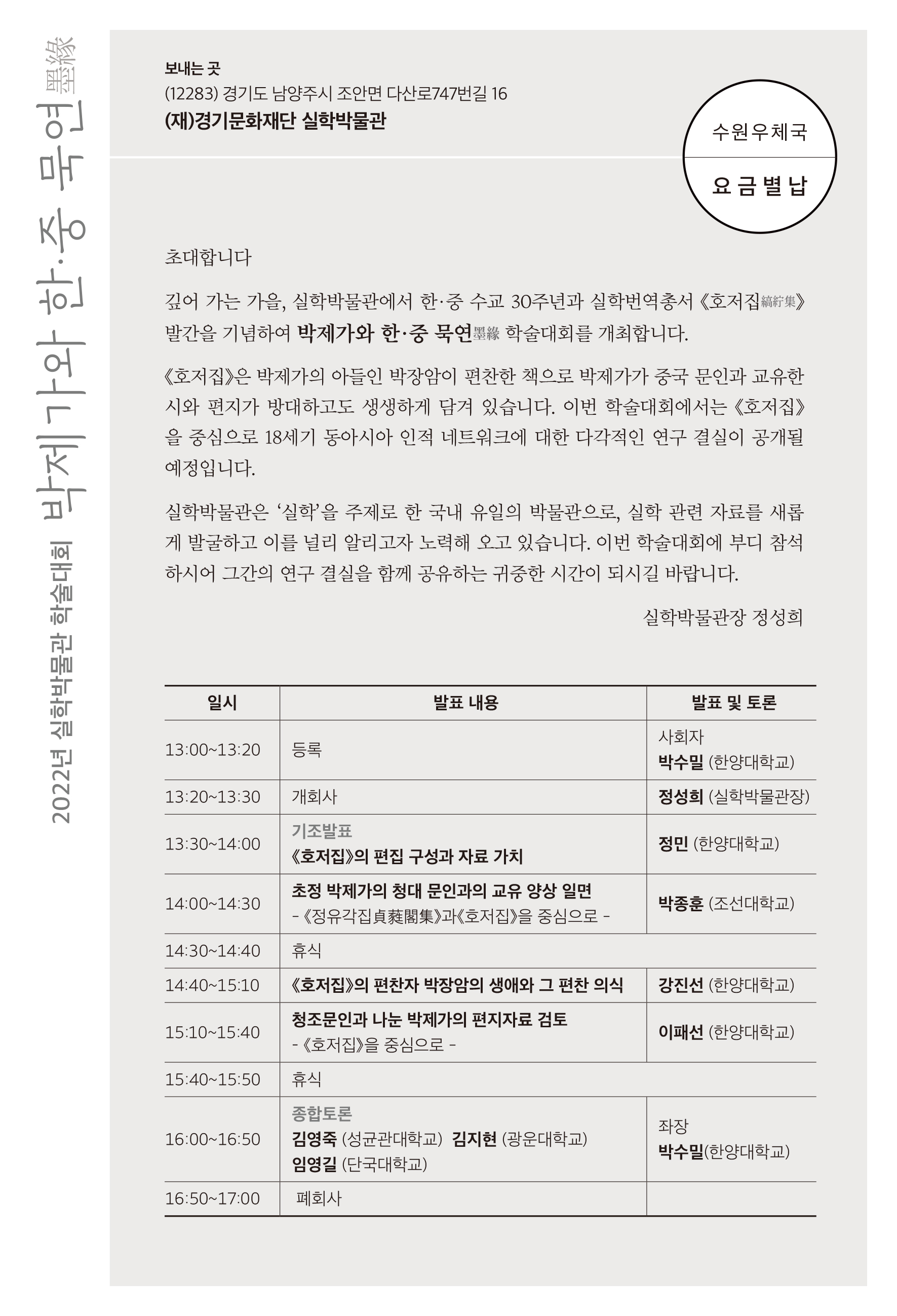 주 제: 2022 한·중수교 30주년 『호저집』 번역서 발간 기념 학술대회 <박제가와 한·중 묵연>