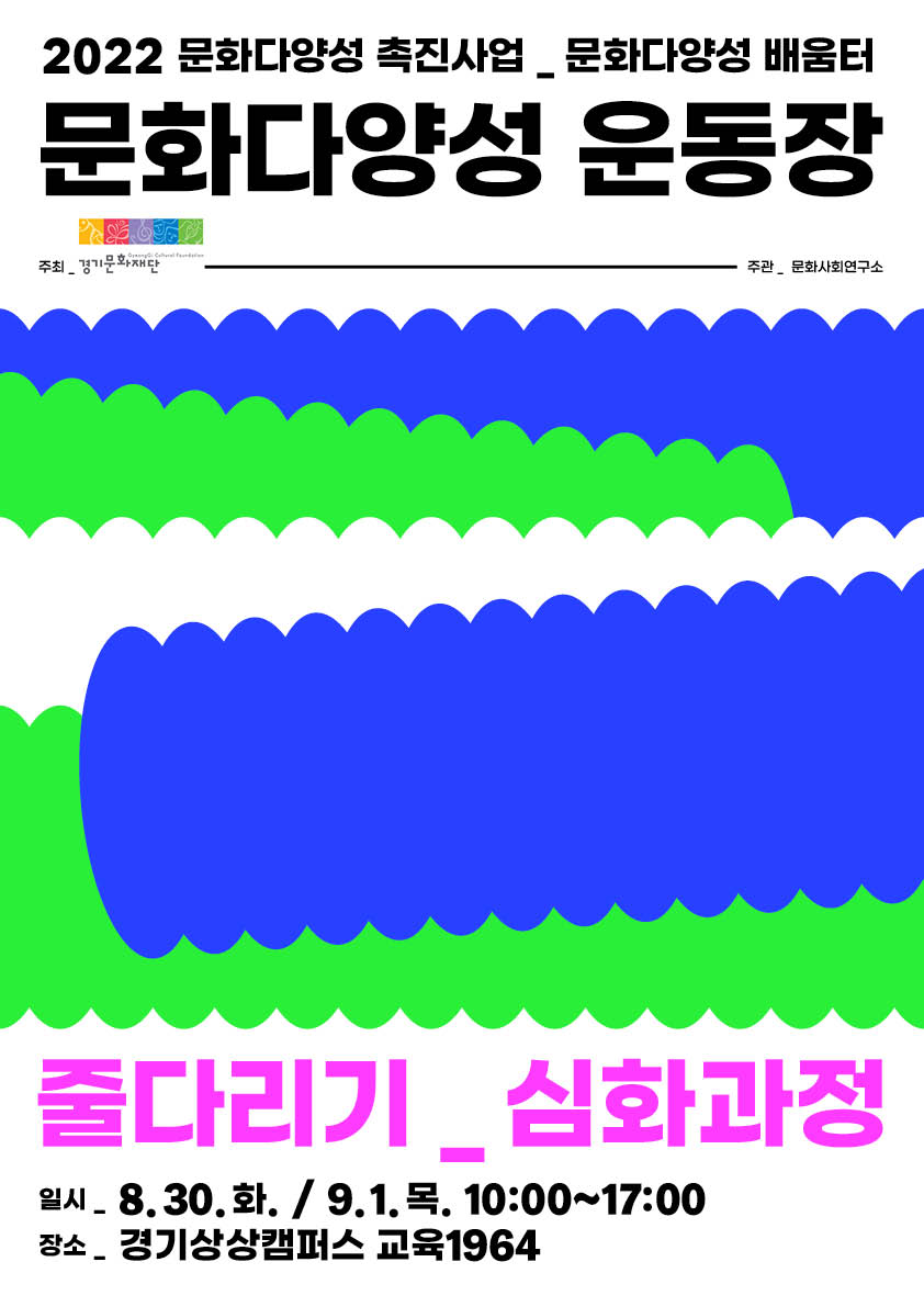 경기문화재단(대표이사 강헌)은 2022년 8월 30일(화), 9월 1일(목) 이틀 동안 2022 문화다양성 배움터 <문화다양성_줄다리기> 워크숍을 수원 경기상상캠퍼스 <교육1964>에서 개최한다.