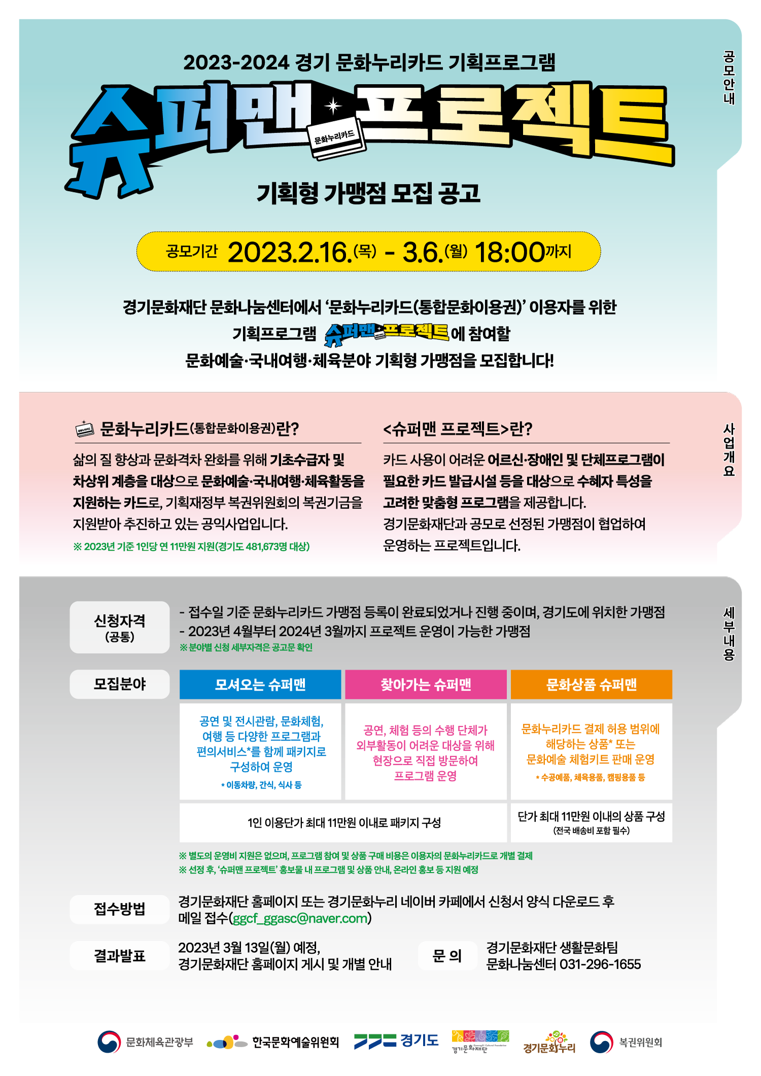- 경기문화재단, 2023-2024 문화누리카드 기획프로그램 「슈퍼맨 프로젝트」 참여 가맹점 모집.pdf (326.93 KB)