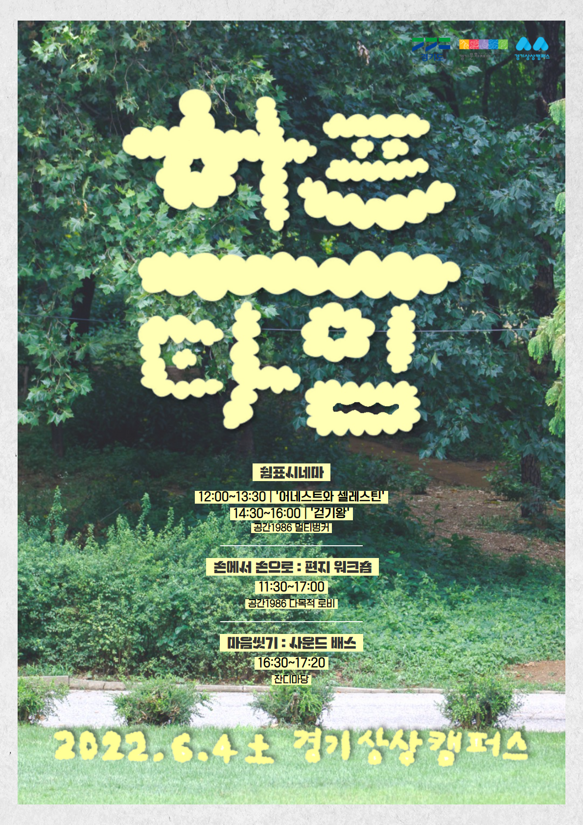 경기문화재단(대표이사 강헌) 경기상상캠퍼스가 다가오는 6월 4일, 기획행사 <하프-타임Ⅰ>을 개최한다. 이번 6월 기획행사는 한 해의 중간인 6월을 맞이하여 지난 반년 간의 삶을 돌아보고 남은 시간을 보낼 에너지를 얻게 하는 다양한 문화행사로 마련되었다. 영화 상영회 <쉼표시네마>를 비롯하여 편지 워크숍 <손에서 손으로>, 명상 수업 <마음씻기 – 사운드 배스> 등 도민을 위한 다채로운 프로그램이 운영될 예정이다.