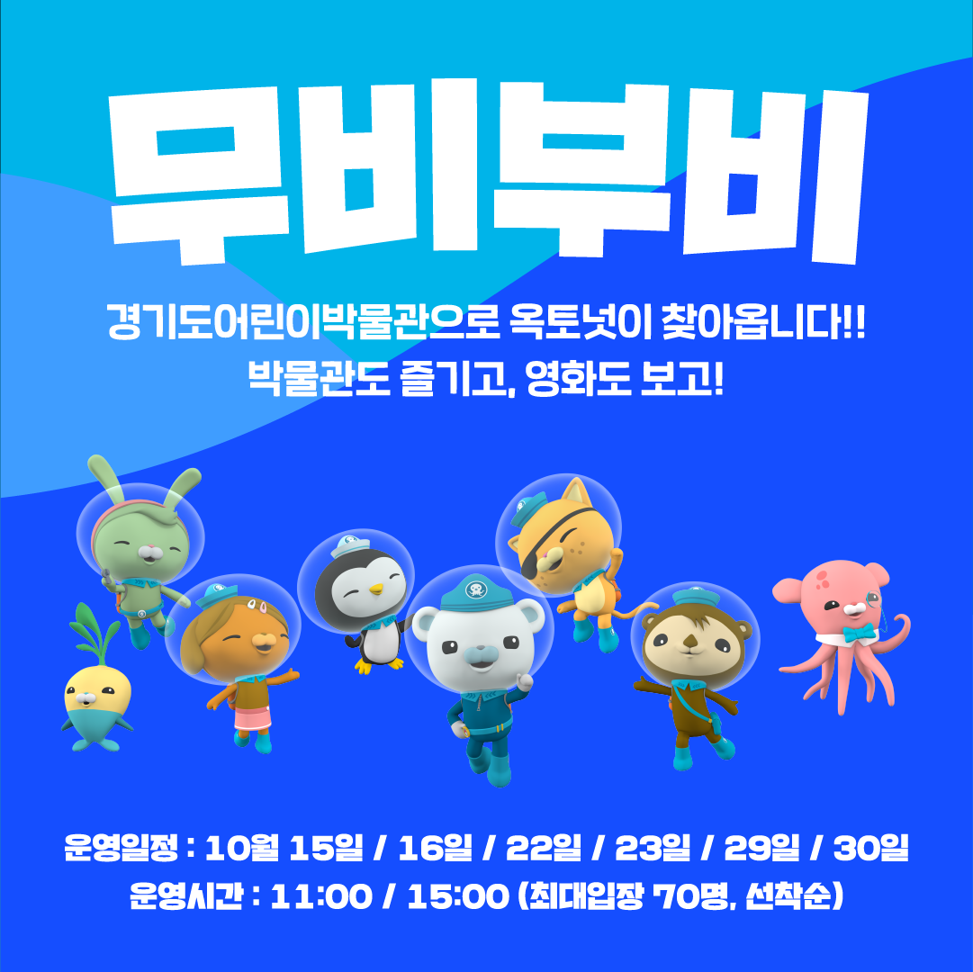 먼저 경기도어린이박물관은 박물관 강당을 아이들 전용 영화관으로 재정비하여 색다르게 영화를 감상할 수 있는 <무비부비> 프로그램을 진행한다. 영화가 시작하기 전 야광봉 굿즈 세트로 춤을 추는 ‘댄스 타임’을 구성하여 영화관 암전에 대한 무서움을 즐거움으로 느낄 수 있도록 준비하였다. 아이들은 영화관에서 춤을 추고, 자유롭게 영화 관람을 할 수 있다. 15일부터 30일까지 매주 주말 11시, 15시 <'바다 탐험대 옥토넛 시즌4 : 더파이널>이 상영된다.