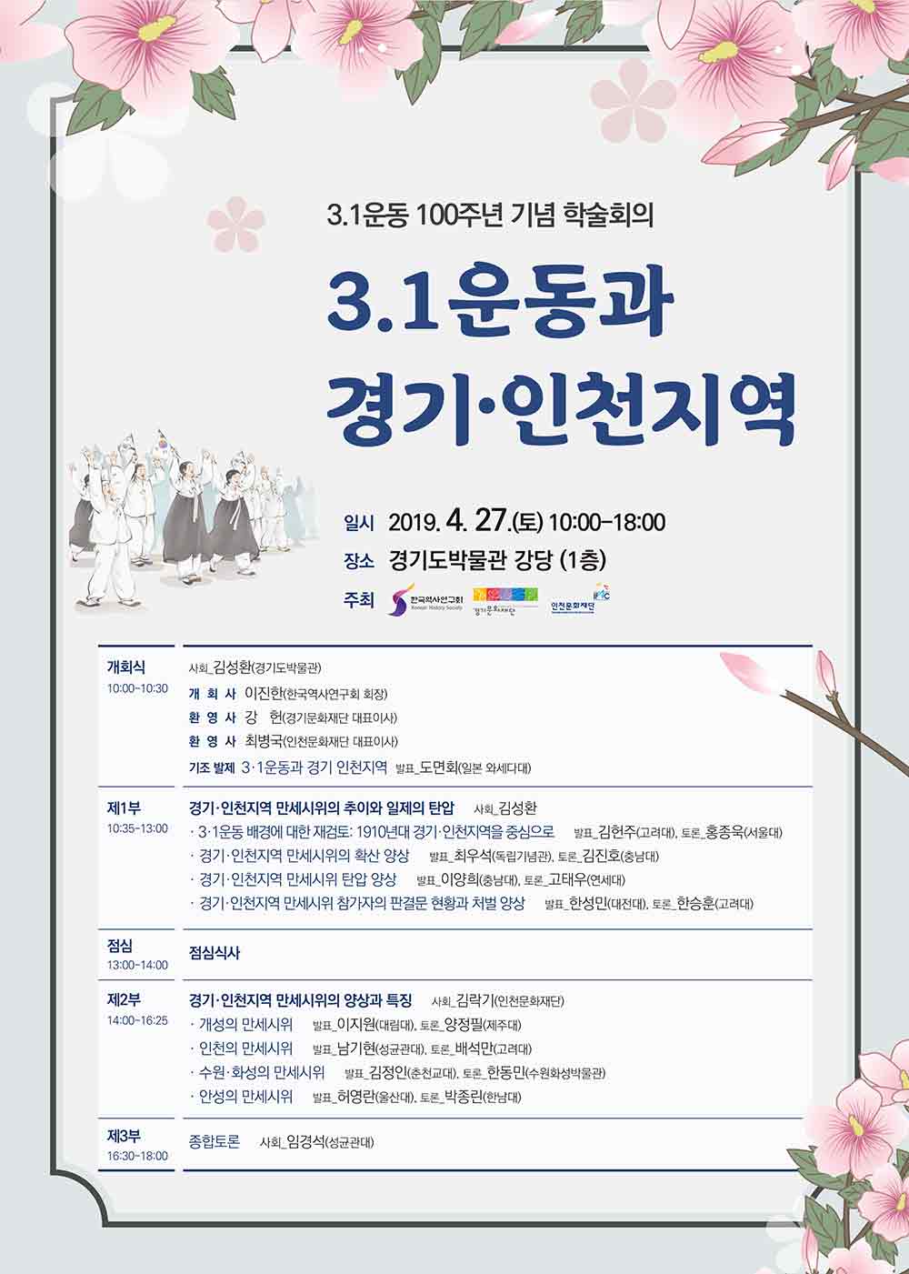 이를 기념하여 경기문화재단은 인천문화재단, 한국역사연구회와 공동으로 “3.1운동과 경기·인천 지역”이라는 주제로 학술회의를 개최합니다.