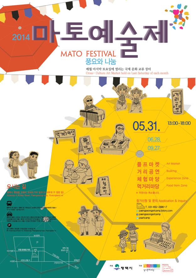 경기문화재단(대표이사 엄기영)과 평택시는 오는 5월 31일(토) 오후 1시부터 6시까지 경기도 평택시 팽성읍 안정리 캠프험프리스(K-6) 앞 로데오거리에서 ‘2014 마토예술제’를 개최한다. 지난해 4회에 걸쳐 성공적인 개최로 지역의 대표 행사로 자리 잡은 예술제는 문화다양성 확산을 위해 경기문화재단과 평택시가 봄, 가을 연4회 매월 마지막 주 토요일에 여는 예술축제다.