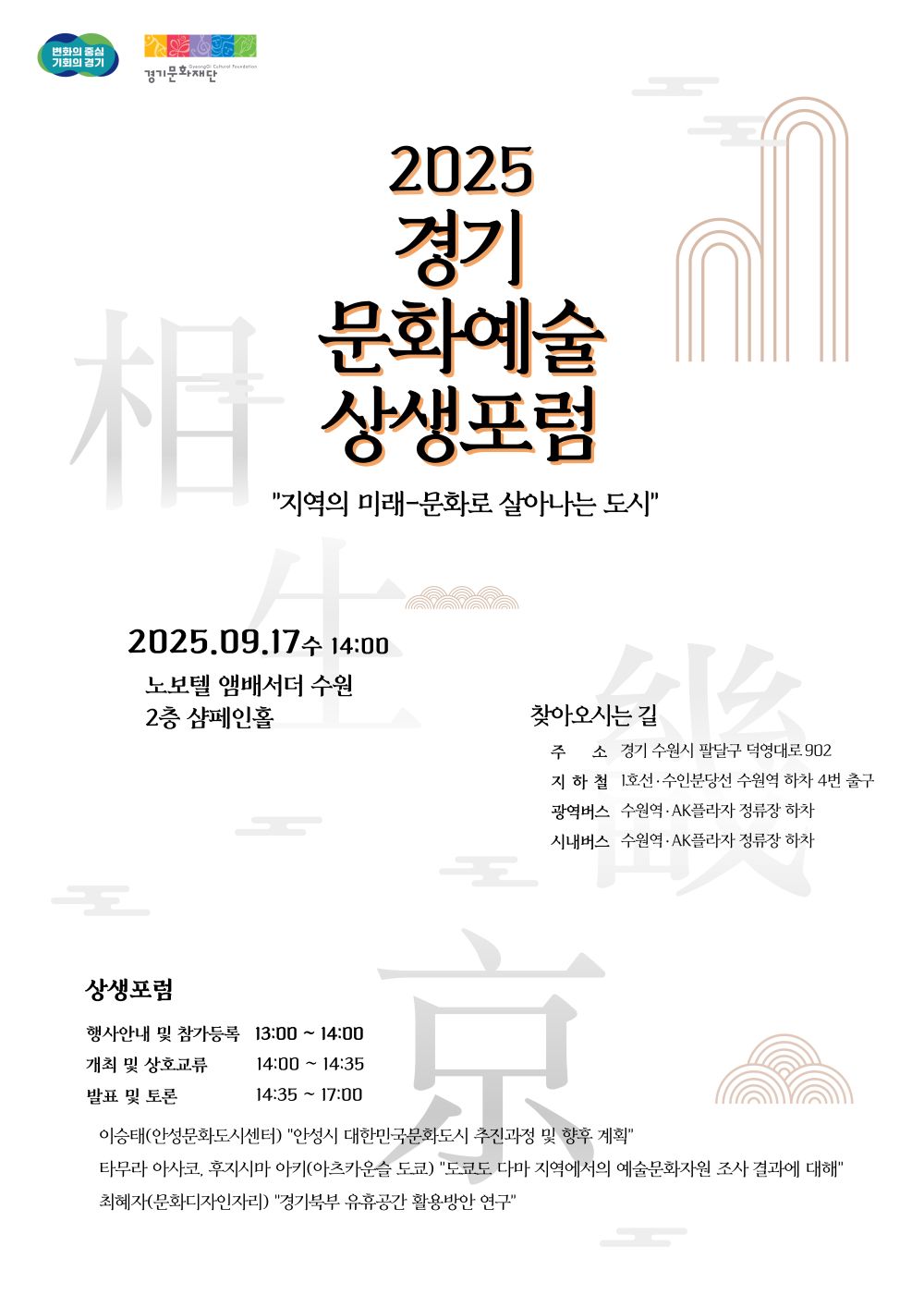2025년 경기문화예술 상생포럼을 "지역의 미래-문화로 살아나는 도시"라는 주제로 다음과 같이 개최하오니, 문화예술에 관심있는 많은 분들의 참여 부탁드립니다.