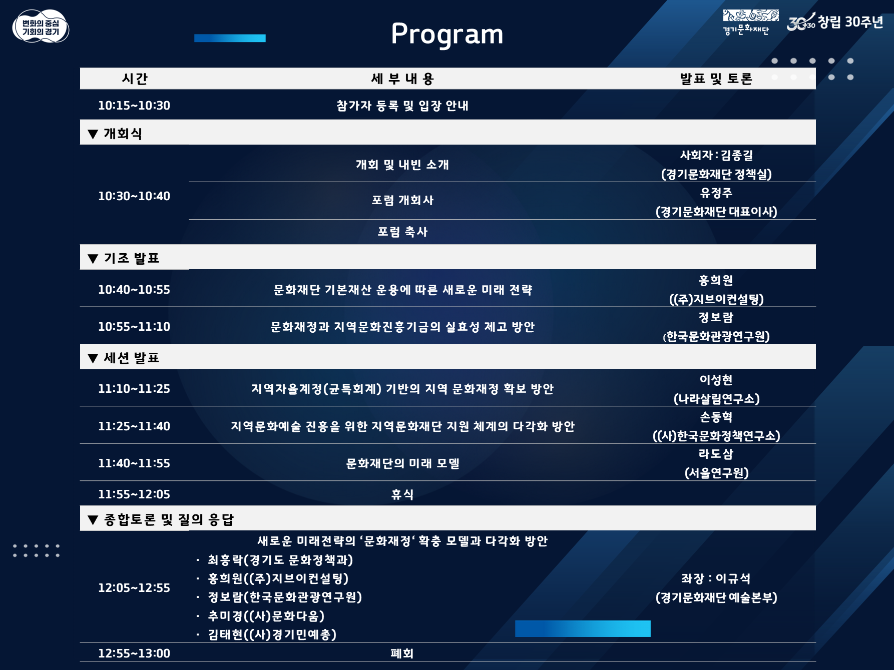 경기문화재단은 창립 30주년(2027년)을 앞두고 재단의 미래 30년을 위한 「경기문화재단 미래전략 포럼」을 개최합니다.