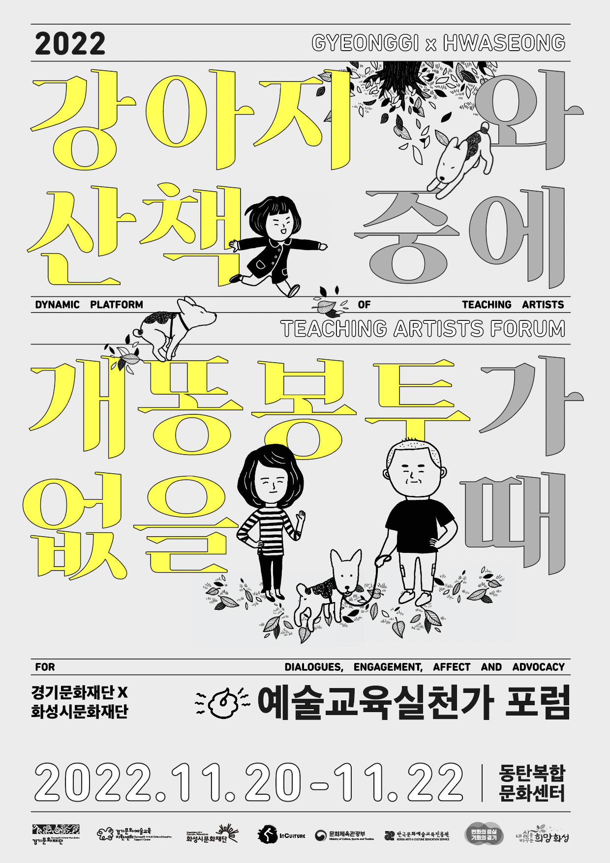 경기문화재단과 화성시문화재단은 11월 20일(일)부터 11월 22일(화)까지 총 3일간 동탄복합문화센터 일대에서 2022 경기예술교육실천가포럼 '강아지와 산책 중에 개똥봉투가 없을 때 시즌2'를 개최한다. 이번 경기예술교육실천가포럼은 문화예술교육 지방이양 정책에 발맞춰 화성시문화재단과 공동주관으로 진행하며, 포럼을 통해 경기도를 중심으로 활동하는 예술교육실천가들이 지역사회에서 예술로서 경험과 생각을 모으고 함께 교류할 수 있는 시간을 가져보려 한다.