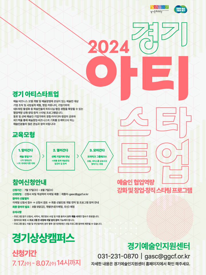 - [보도자료] 경기문화재단, 예술인 협업역량 강화·창업·창직 스타팅 프로그램 2024 〈경기 아티스타트업〉 운영.pdf (208.67 KB)