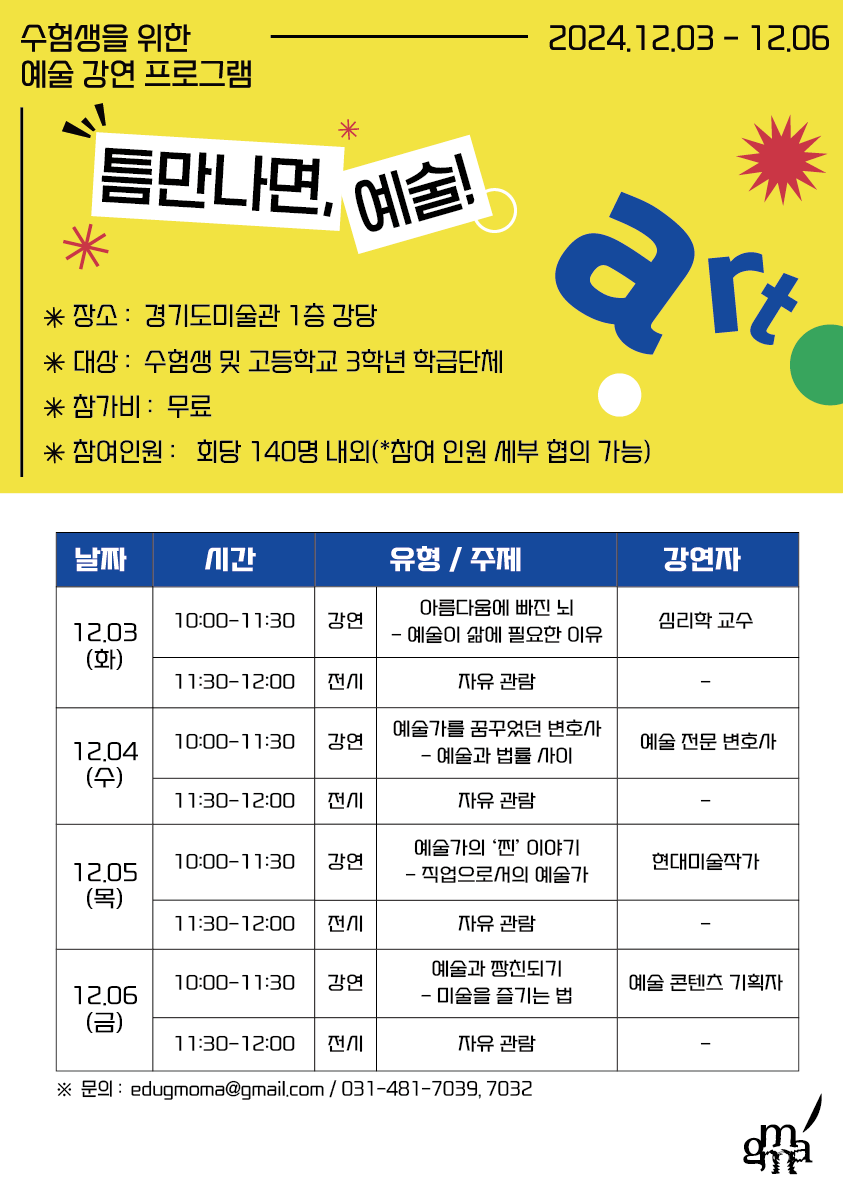 경기도미술관 수험생을 위한 예술 강연 프로그램 〈틈만나면, 예술!〉