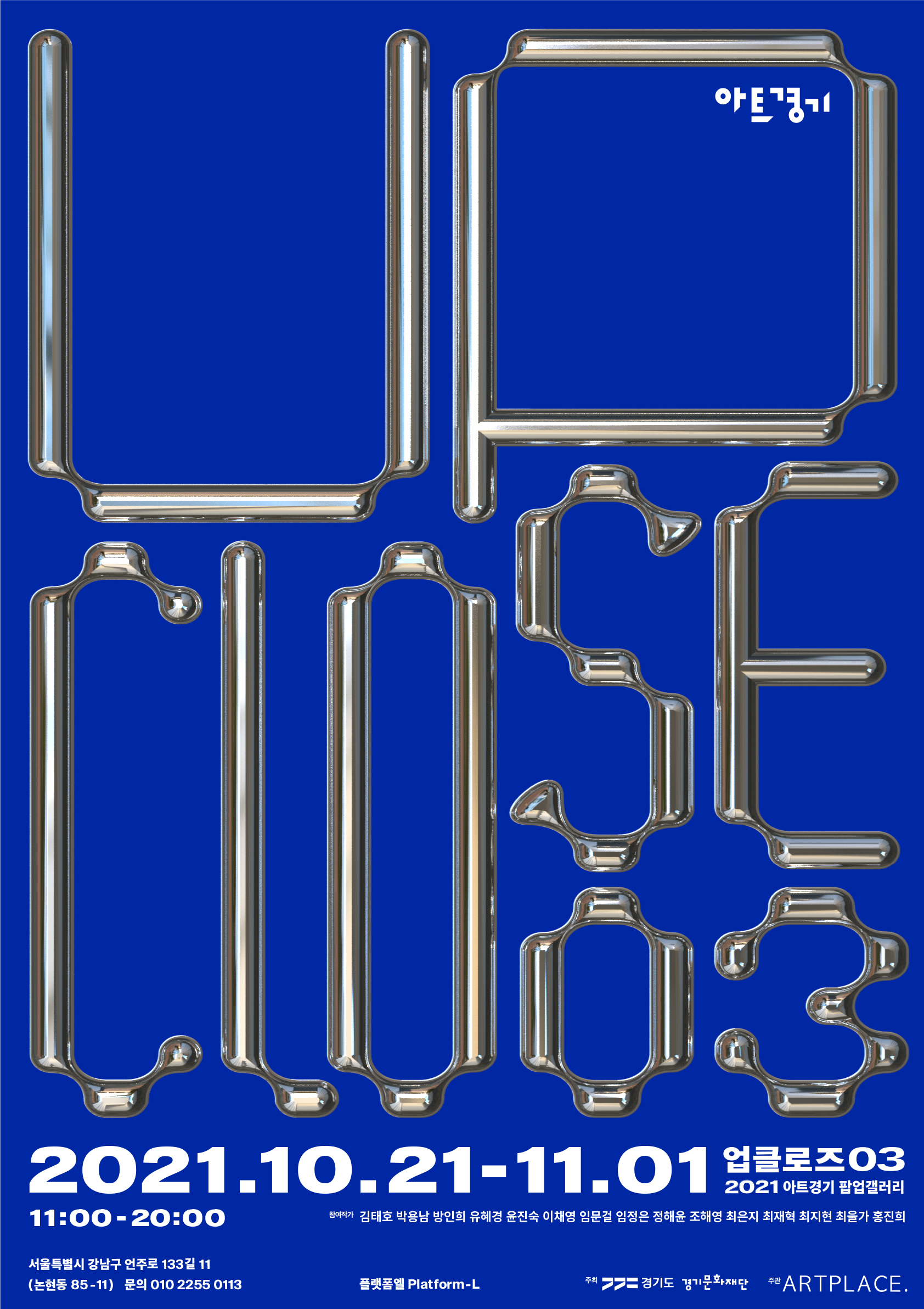 아트경기 팝업갤러리 《업클로즈03》(이하 업클로즈)를 10월 21일(목)부터 11월 1일(월)까지 서울 논현동에 위치한 플랫폼엘 컨템포러리 아트센터에서 개최한다. 본 전시에는 아트경기 선정작가 11인과 추천작가 4인, 총 15인의 작가 100여 점의 작품이 참여한다.