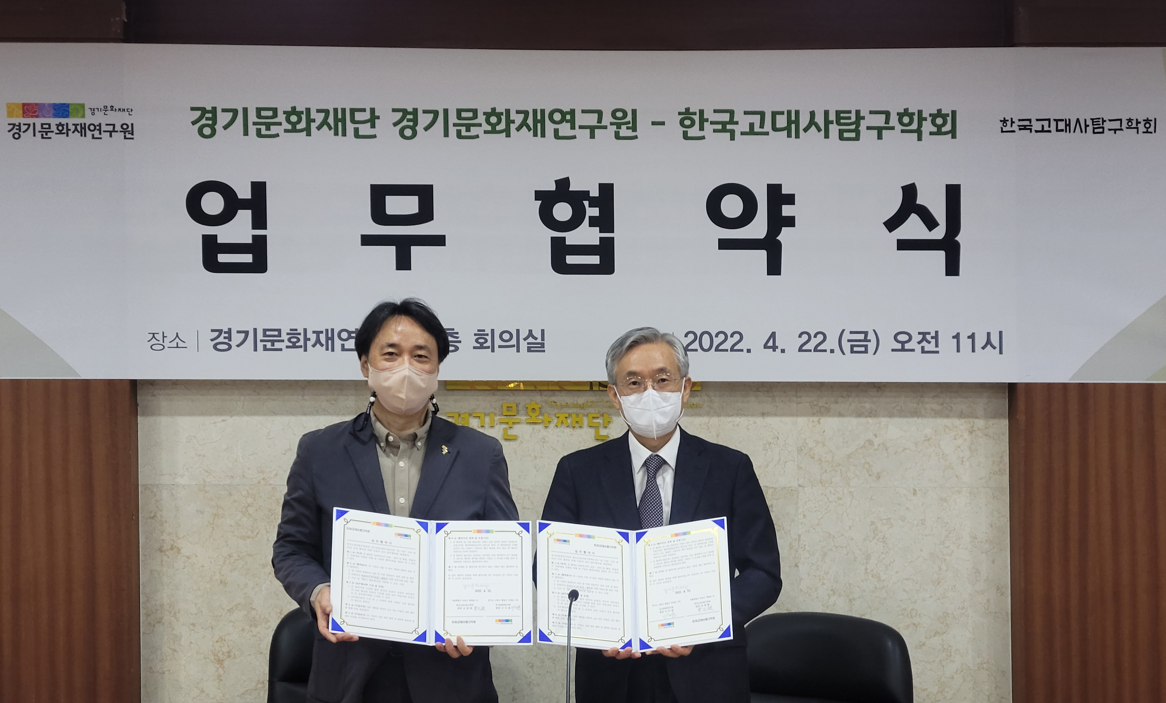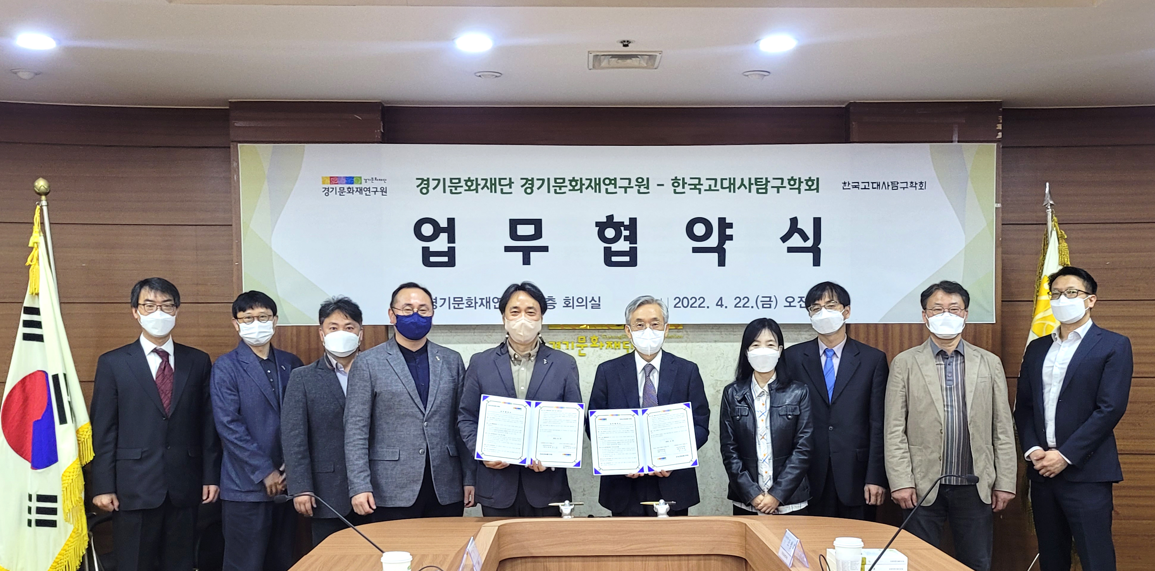 경기문화재단 경기문화재연구원(원장 이지훈)과 한국고대사탐구학회(회장 조범환)은 4월 22일 오전 11시 경기문화재연구원 회의실에서 국내〮 외 문화유산 보존 노력 및 전문인력 교류협력, 공동 학술연구를 위한 업무협약을 체결하였다.