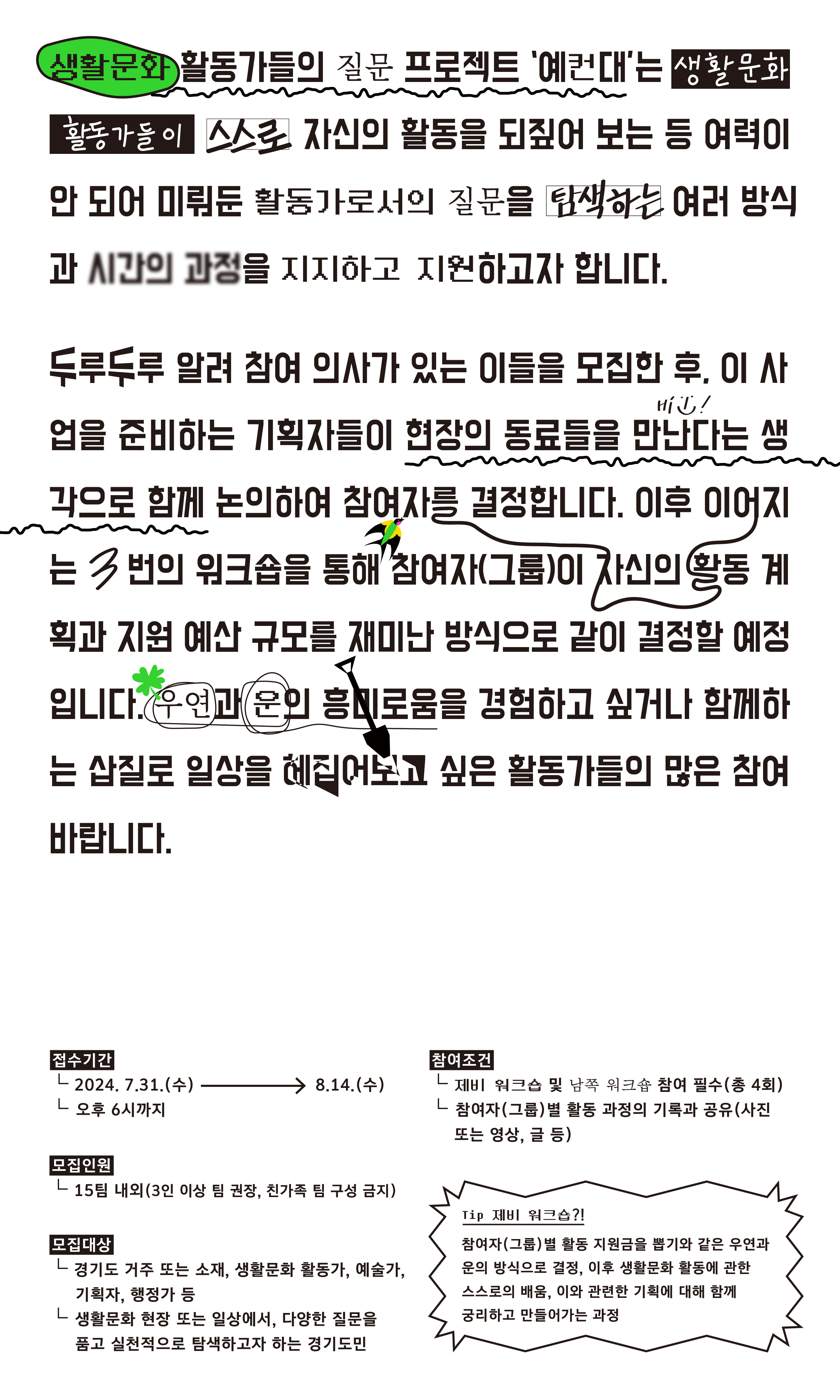※ 제비 워크숍 : 참여자(그룹)별 활동 지원금을 뽑기와 같은 우연과 운의 방식으로 결정, 이후 생활문화 활동에 관한 스스로의 배움, 이와 관련한 기획에 대해 함께 궁리하고 만들어가는 과정