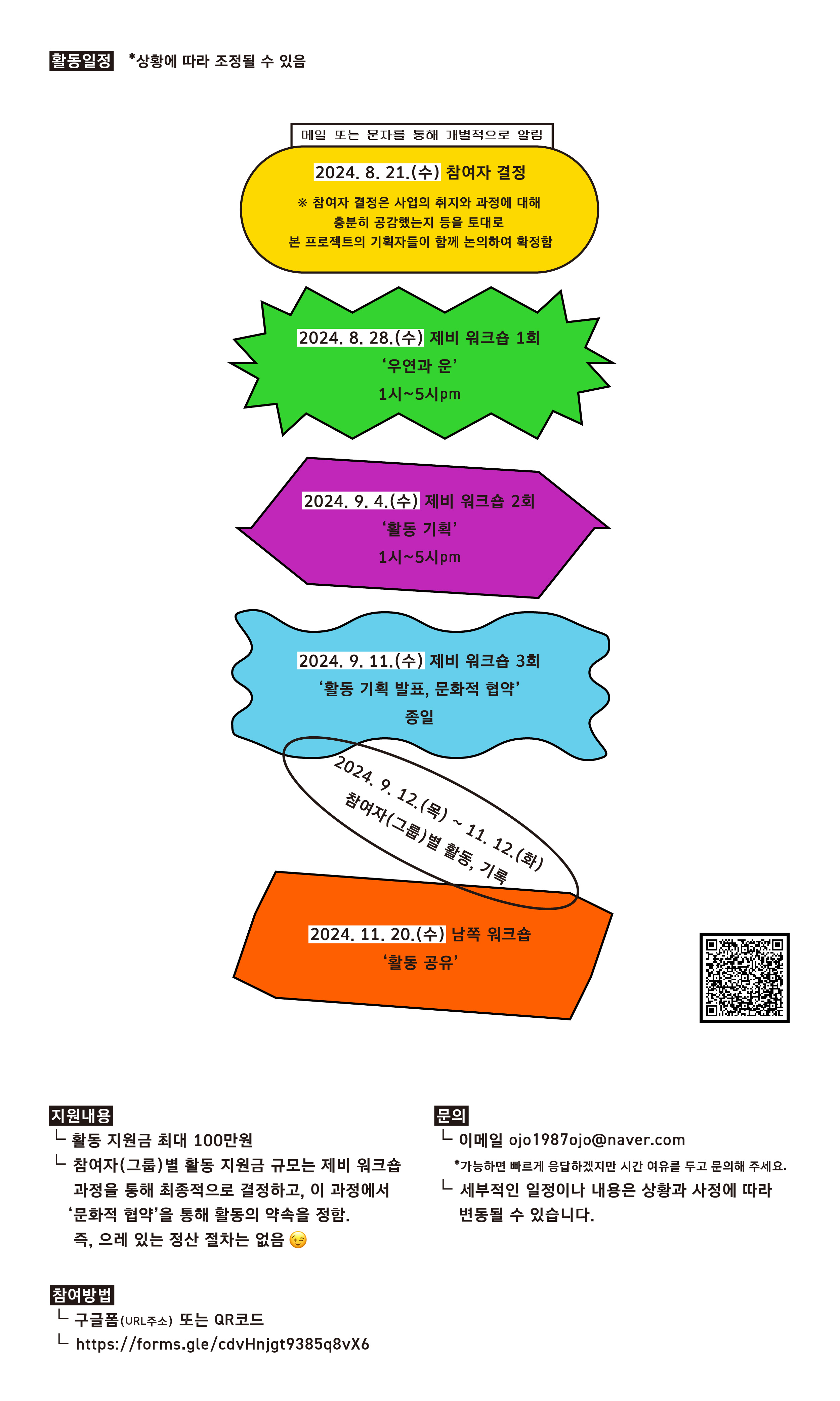 -참여자(그룹)별 활동 지원금 규모는 제비 워크숍 과정을 통해 최종적으로 결정하고, 이 과정에서 ‘문화적 협약’을 통해 활동의 약속을 정함. 즉, 으레 있는 정산 절차는 없음^^