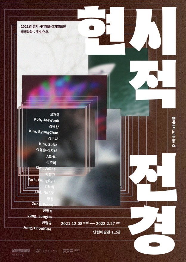 경기문화재단은 올해 초 경기도 예술진흥 공모지원사업 시각예술 지원프로그램을 통해 지원받을 19인의 작가를 선정했다. 8개월여의 창작기간을 거쳐 완성된 그들의 신작이 경기 남부와 북부에서 12월 순차적으로 공개된다. 경기 남부에서 개최하는 전시는 《현시적 전경(顯示的 全景); 들어내서 드러나는 것》이라는 제목으로 단원미술관에서 12월 8일부터 내년 2월 28일까지 개최되며, 고재욱, 김병찬, 김수나, 김주리, 박웅규, 임노식, 정운, 정정호, 정철규, ADHD (총10인/팀)의 작업을 만날 수 있다. 창작의 욕구를 치열하고도 집요하게 드러내며 자신의 영역을 구축하는 10작가/팀의 현시적 전경을 따라가면서 색다른 시각적 경험을 해볼 수 있을 것이다.