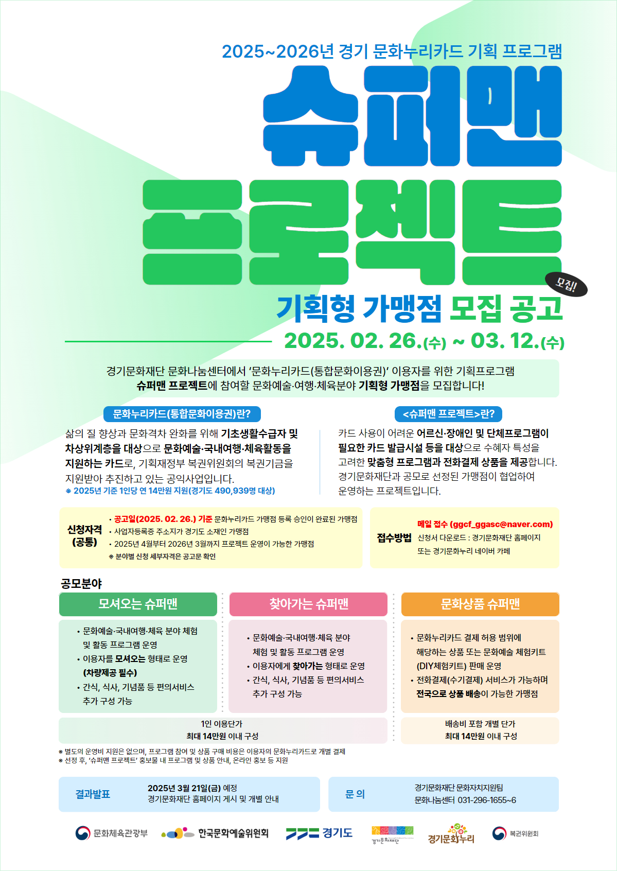 - 4.2025~2026년 경기 문화누리카드 기획프로그램 슈퍼맨 프로젝트 기획형 가맹점 공모 포스터.jpg (1.25 MB)